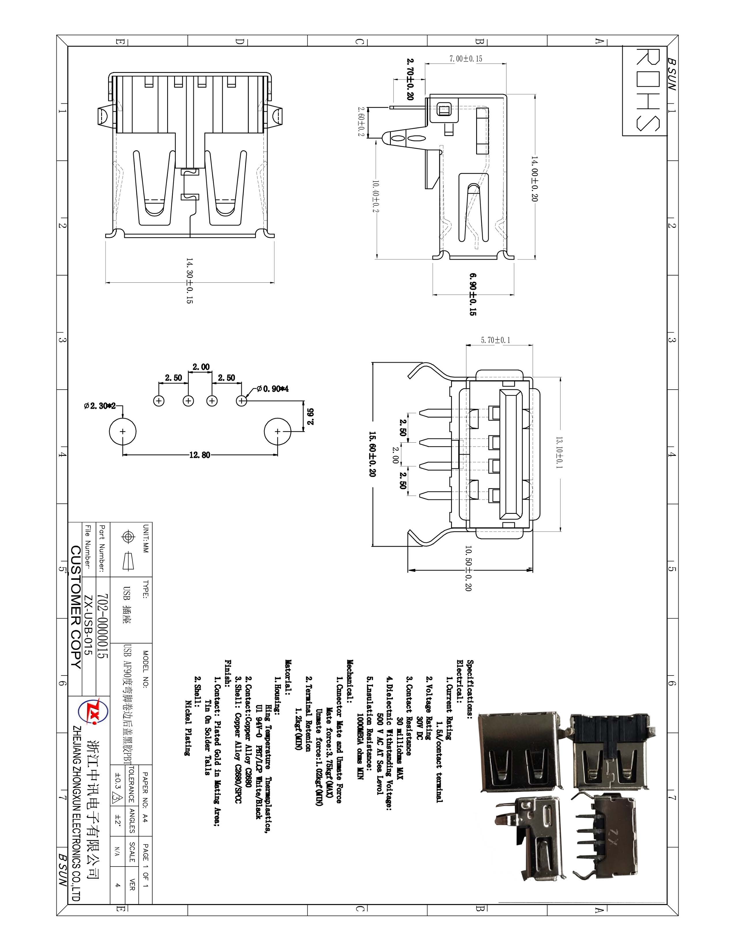 USB A型插座;4芯黑色;50V 1A;90度彎式PCB焊接屏蔽插座;